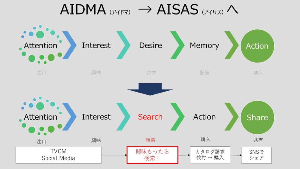 ひと昔前であれば、商品に興味を持ったら「今度お店に行ったときに買おう」という行動フェーズに入っていましたが、今は興味を持ったら情報収集、すなわち「検索(Search)」というフェーズに入ります。